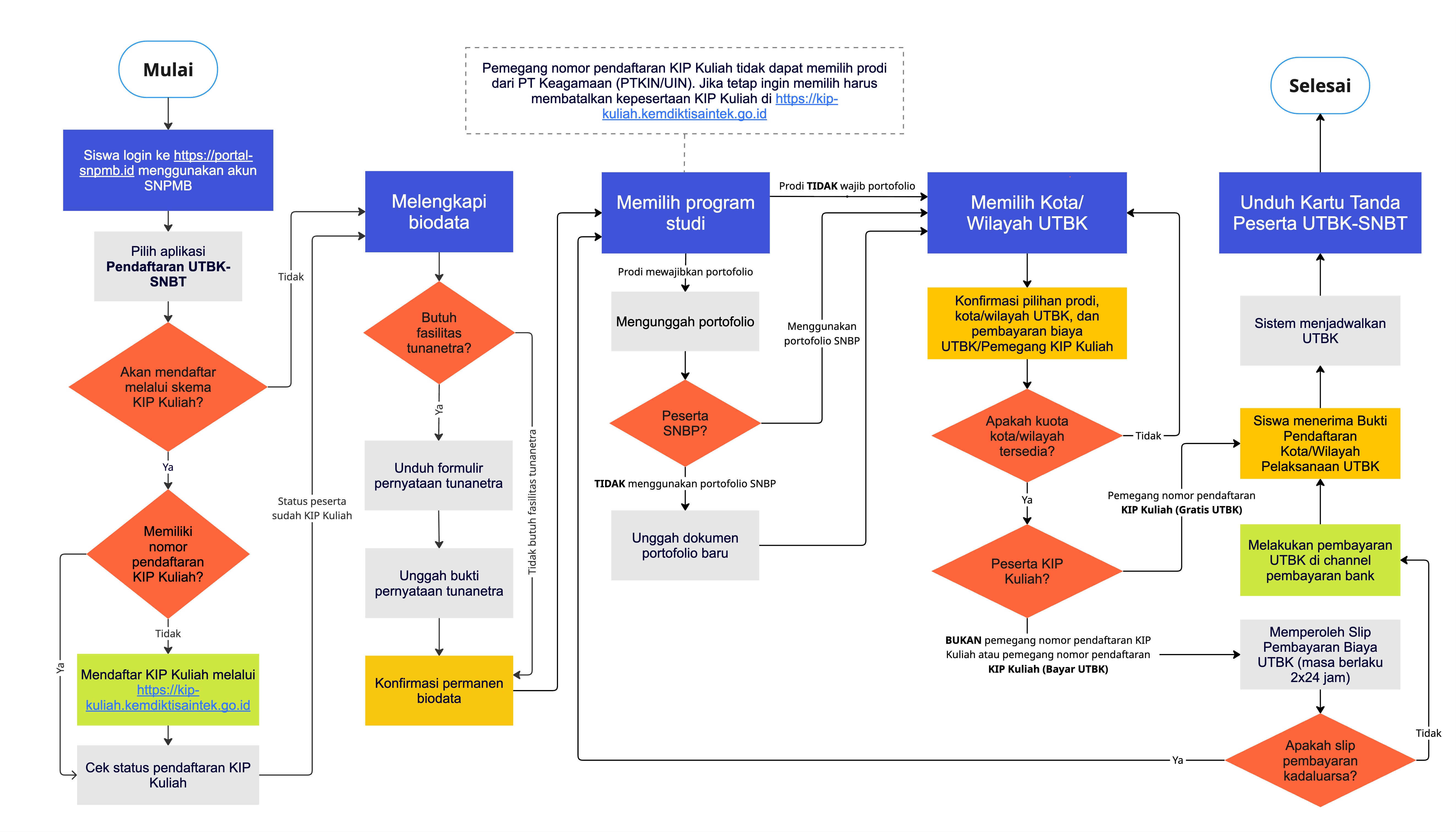 - KIP-Kuliah untuk siswa pemilik KIP dengan pendaftaran khusus di Portal SNPMB yang bisa diakses melalui: https://kip-kuliah.kemdikbud.go.id/